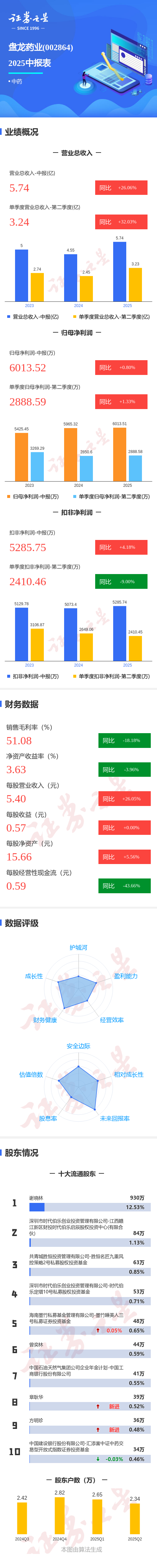 证券之星消息,盘龙药业2025年中报显示,公司主营收入5.74亿元,同比上升26.06%;归母净利润6013.52万元,同比上升0.81%;扣非净利润5285.75万元,同比上升4.19%;其中2025年第二季度,公司单季度主营收入3.24亿元,同比上升32.04%;单季度归母净利润2888.59万元,同比上升1.33%;单季度扣非净利润2410.46万元,同比下降9.01%;负债率29.46%,投资收益-11.95万元,财务费用-1185.77万元,毛利率51.08%。