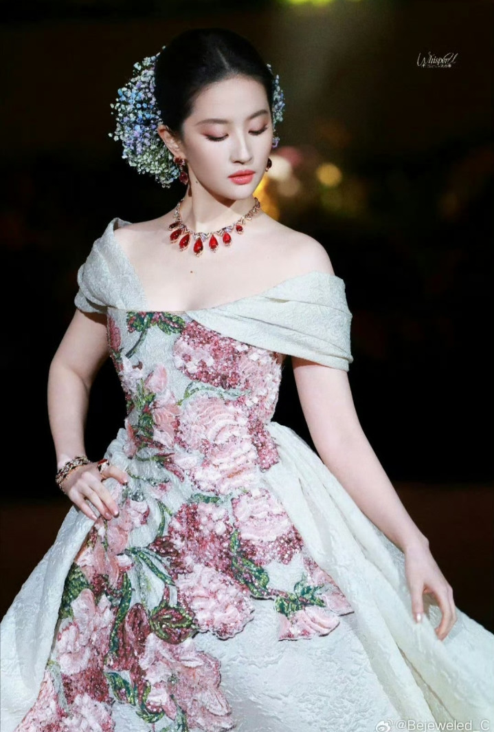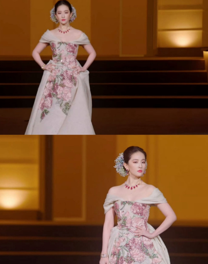 红毯时刻,刘亦菲用行动回应所有质疑。她摒弃了去年“黄玫瑰花瓣雨”的浪漫,转而以Elie Saab高定礼服演绎东方神韵——裙摆上手工刺绣的牡丹与芍药随步伐摇曳,搭配宝格丽Serpenti系列高级珠宝,将“花神”主题诠释得淋漓尽致。社交平台瞬间沸腾,“等比例长大的天仙”“内娱颜值天花板”等话题冲上热搜。更耐人寻味的是,她成为唯一拥有独立热搜词条的嘉宾,连压轴出场时外滩的无人机表演都特意设计成花瓣形状。