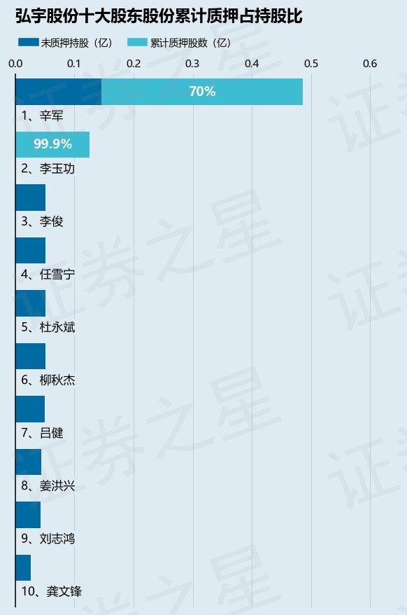 截止本公告日,股东辛军已累计质押股份3399.4万股,占其持股总数的70.0%,股东李玉功已累计质押股份1260.07万股,占其持股总数的99.9%。本次质押后弘宇股份十大股东的累计质押股份占持股比例(占持股比例的计算以公司最新一期财务报表公布的十大股东的持股总数为基准)见下图:
