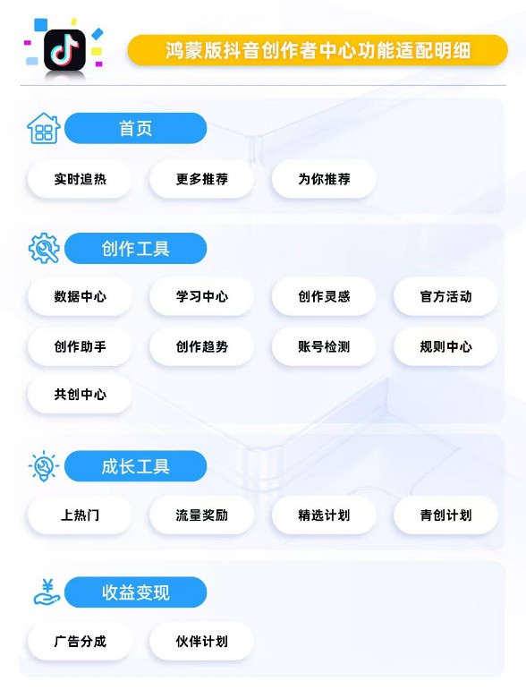 先说鸿蒙版抖音,它的创作者中心更像一个全能的“商业伙伴”,思路清晰地将服务分为创作、成长、变现三大模块。